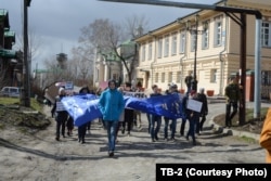 Шествующие развернули новый главный баннер с лозунгом "Городу нужны мы, а не эта тряпка", сообщает наш корреспондент.