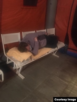 – Нас привезли вечером, в 22.20, – рассказала Римма Убейконь, жительница Новосибирска, госпитализированная с двухсторонней пневмонией. – Почти час мы ждали в машине скорой помощи, и это было комфортно и с заботой. Потом, когда подошла наша очередь, сотрудник медицины катастроф нас сопроводил в палатку. Эти сотрудники – координаторы между машинами скорой помощи и приемным покоем. Связь со стационаром у них через телефон в спецмашине. Один из них периодически заходил в палатку, спрашивал: "Не холодно ли?" Воды принес. В палатке мы переночевали на железных стульях. Больше там ничего нет. Люди сидят с температурой на этих стульях. В тот момент в палатке было еще четыре мне незнакомых человека. Никакой помощи не получали. И только утром нас с мужем перевели в стационар.