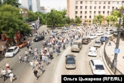 Выходили к протестующим и представители краевого правительства: пресс-секретарь губернатора Надежда Томченко и первый зампред регионального правительства Владимир Хлапов. Они хоть и призывали разойтись: мол, коронавирус же, но поблагодарили людей за поддержку губернатора. А после этого перед собравшимися выступили все желающие – в общей сложности таких набралось около 10 человек. Некоторые даже не представлялись. В основном ораторы задавались одними и теми же вопросами: почему убийства 16-летней давности расследовались так долго, почему только сейчас, когда Фургал стал губернатором, его арестовали? Впрочем, из-за постоянного скандирования лозунга "Свободу!" и звука клаксонов проезжавших мимо машин, водители которых таким образом поддерживали собравшихся, слова выступавших можно было разобрать с трудом, не помогал даже мегафон.