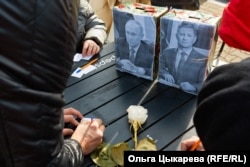 После того как митингующие вернулись на площадь, один из них бросил перед крыльцом правительства портрет Путина. Сначала к нему положили цветы с черной лентой, затем стали топтать его, кто-то плевал, кто-то бросал мелочь как подаяние, кто-то, как на могиле, поставил рюмку и конфеты.