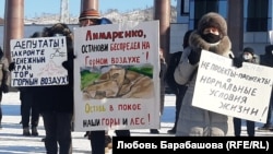 Представители "Экологической вахты Сахалина" использовали митинг, чтобы потребовать остановить вырубку леса, которая с огромными нарушениями идет ради прокладки трасс горнолыжного курорта.