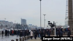 Ранее в соцсетях бизнесмен Булат Абилов призывал граждан выйти 13 февраля к 12:00 по местному времени (9:00 мск) на митинг в память о жертвах январских событий. На площади Республики собрались около 500 жителей, некоторые принесли транспаранты и фотографии погибших во время январских протестов. Митинг начался с молитвы и выступления активистов.